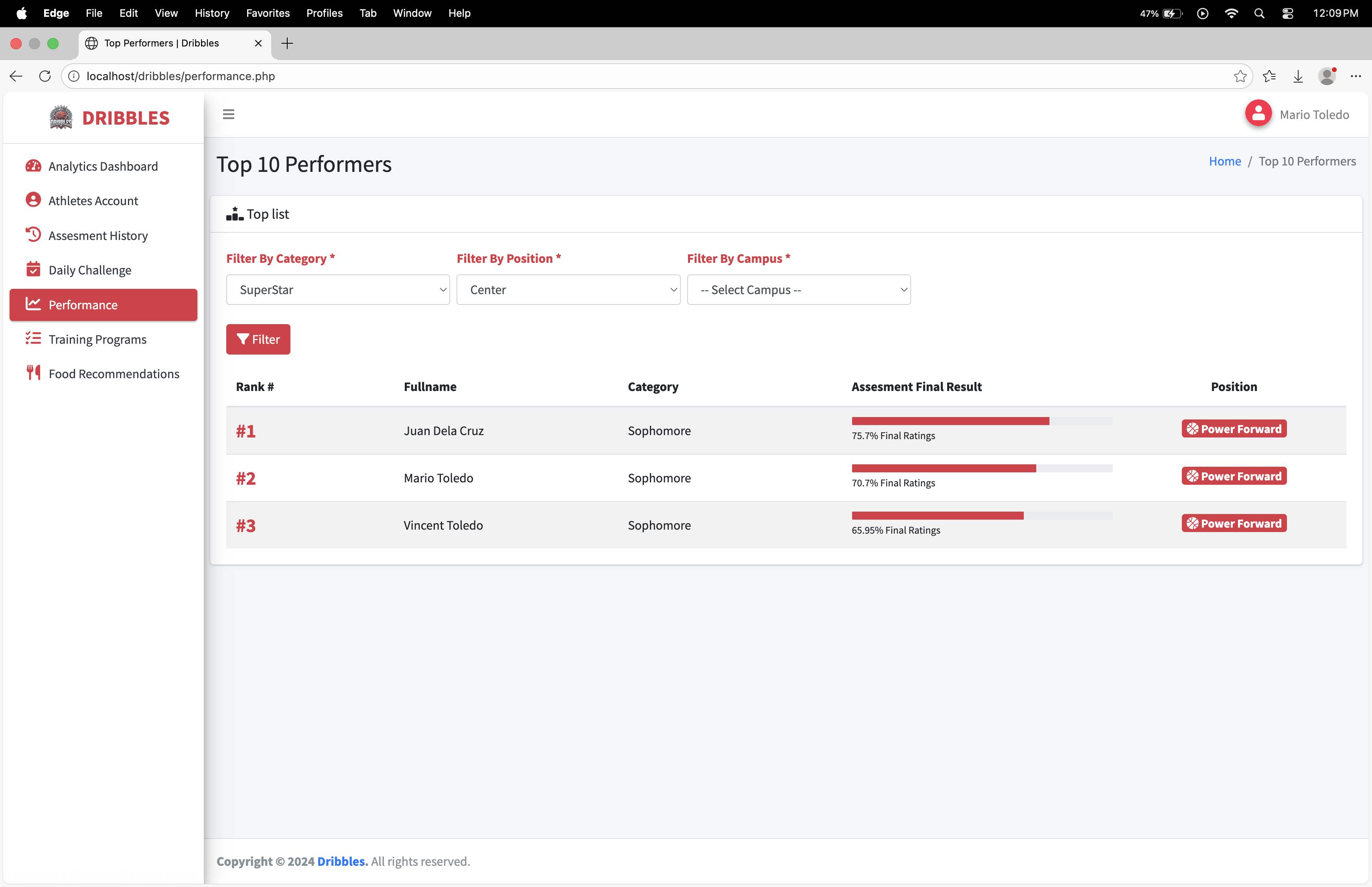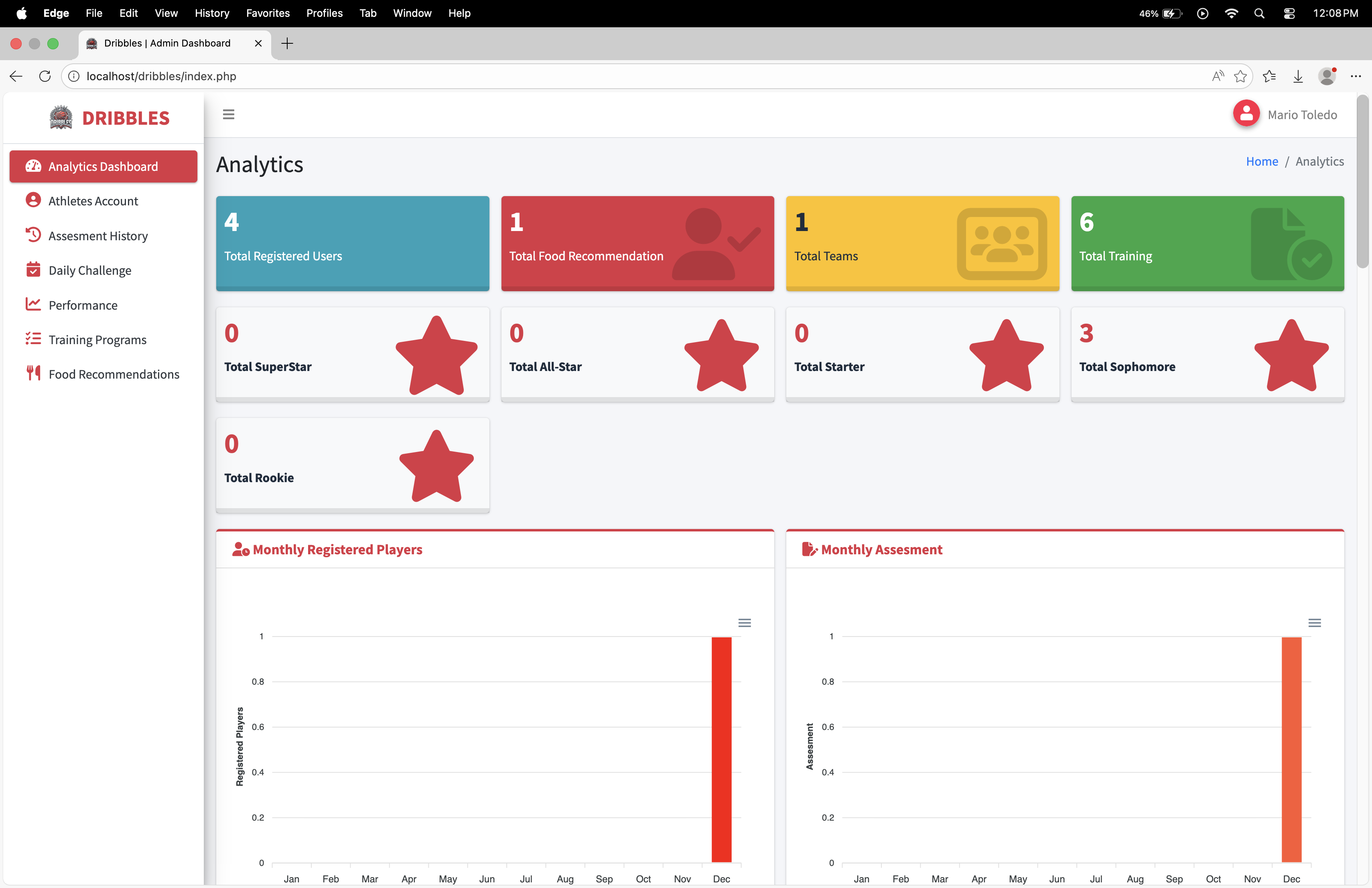Dribbles is a comprehensive, data-driven athlete management and development platform designed specifically for basketball student-athletes, such as those at BSU Malvar. The system bridges the gap between raw potential and structured growth by transforming personal athletic data into actionable, personalized training and nutrition plans.