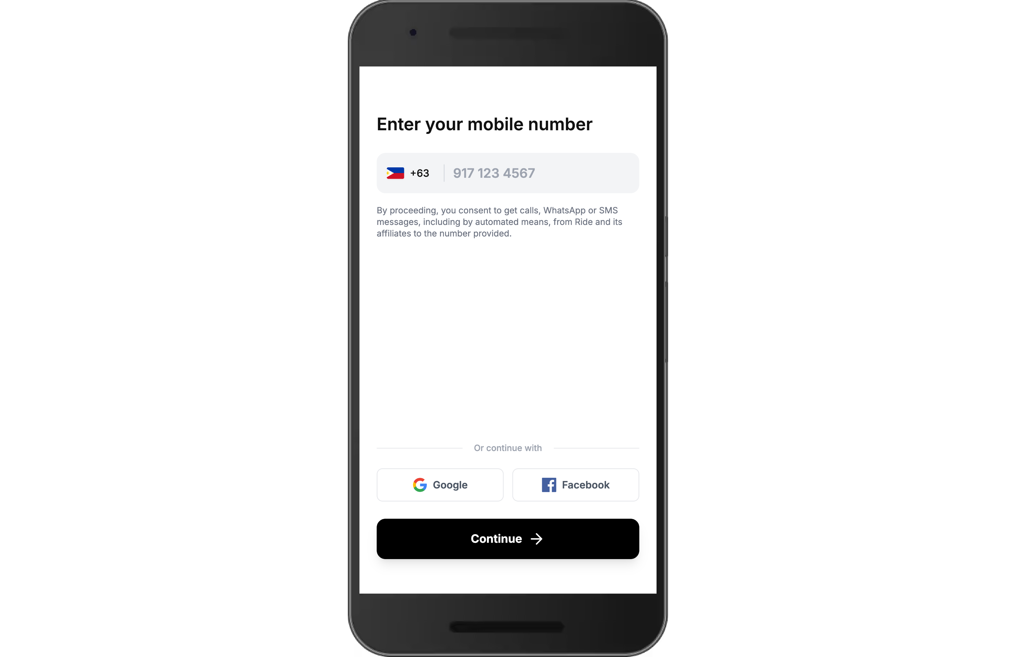 Mobile Entry: A prominent "Enter your mobile number" header with a localized country code picker (featuring the Philippines flag) and a placeholder for phone input.