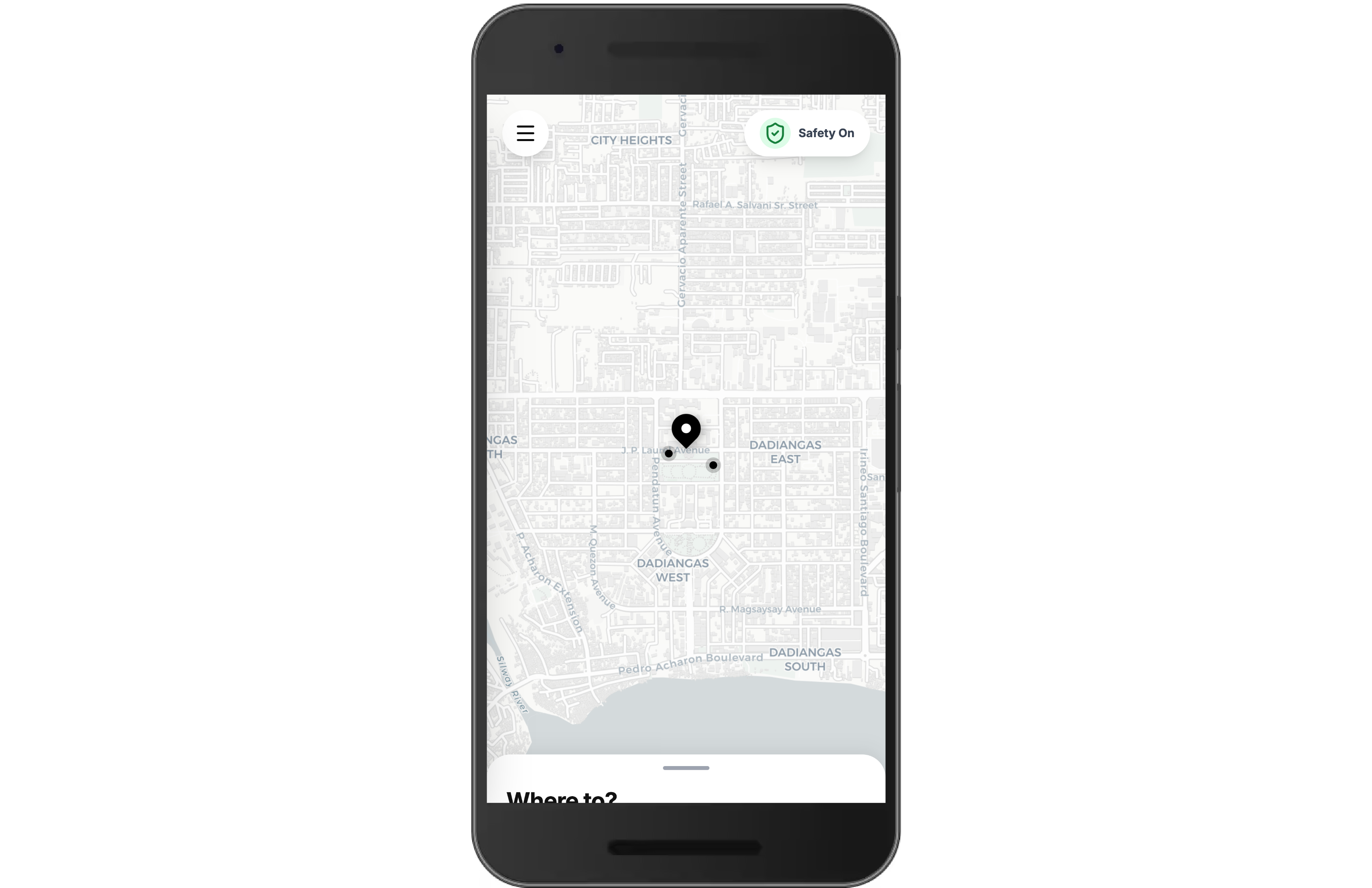 Search Entry: A "Where to?" bottom sheet that slides up, allowing users to quickly input their destination.
