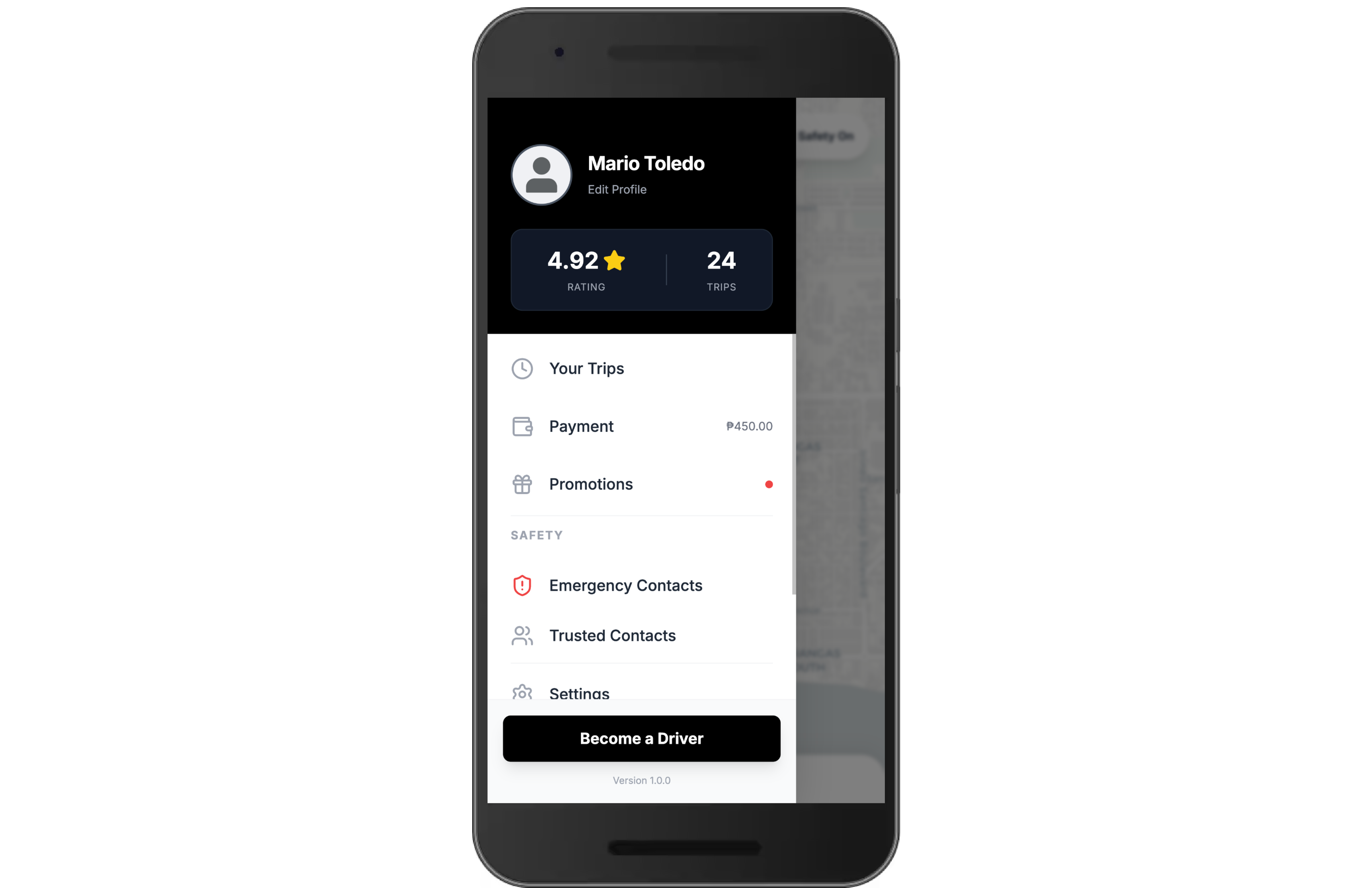 "Become a Driver" CTA: A prominent, high-contrast black button located at the bottom of the sidebar. This allows users to easily transition from a passenger to a rider/driver, facilitating the application process directly within the app.