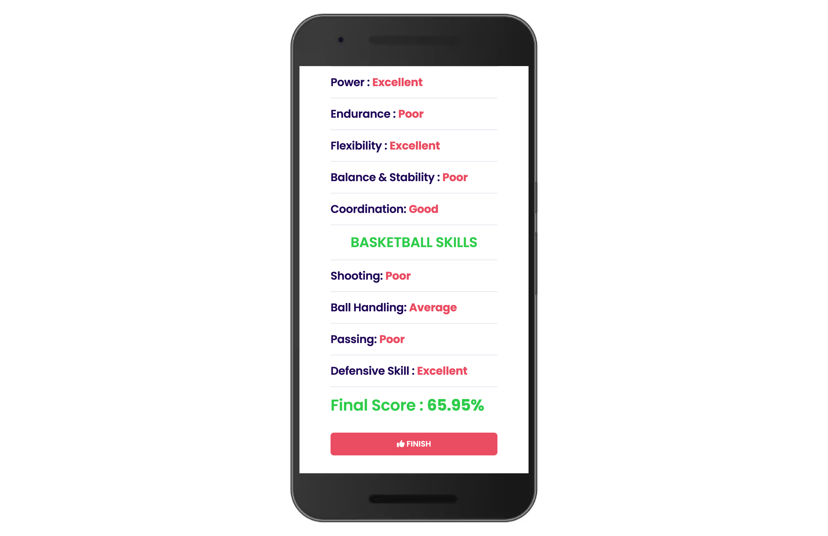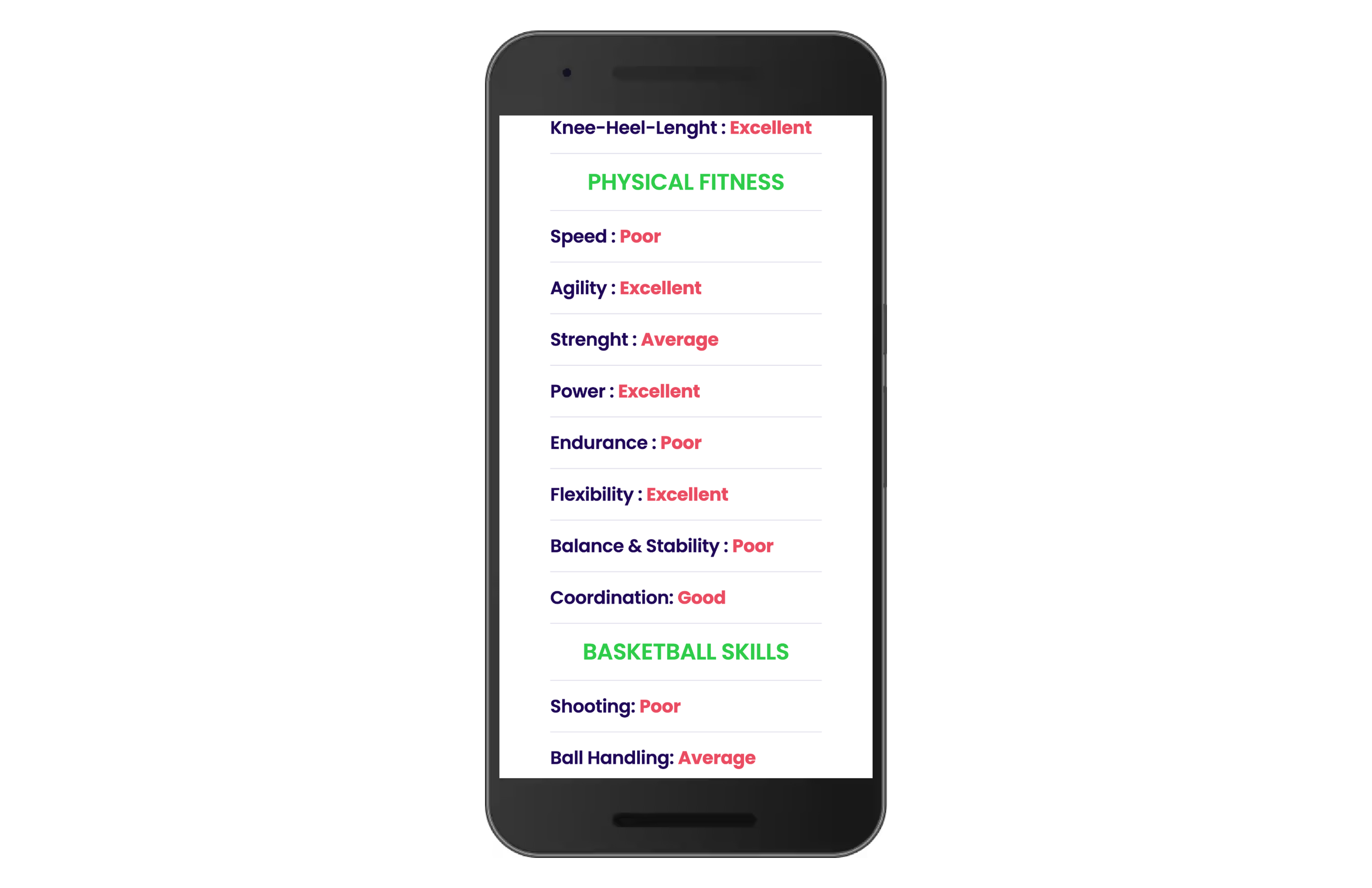 Visual Analytics: Star-rated breakdowns of strengths and weaknesses across all measured attributes (e.g., "Shooting: Poor," "Defensive Skill: Excellent").