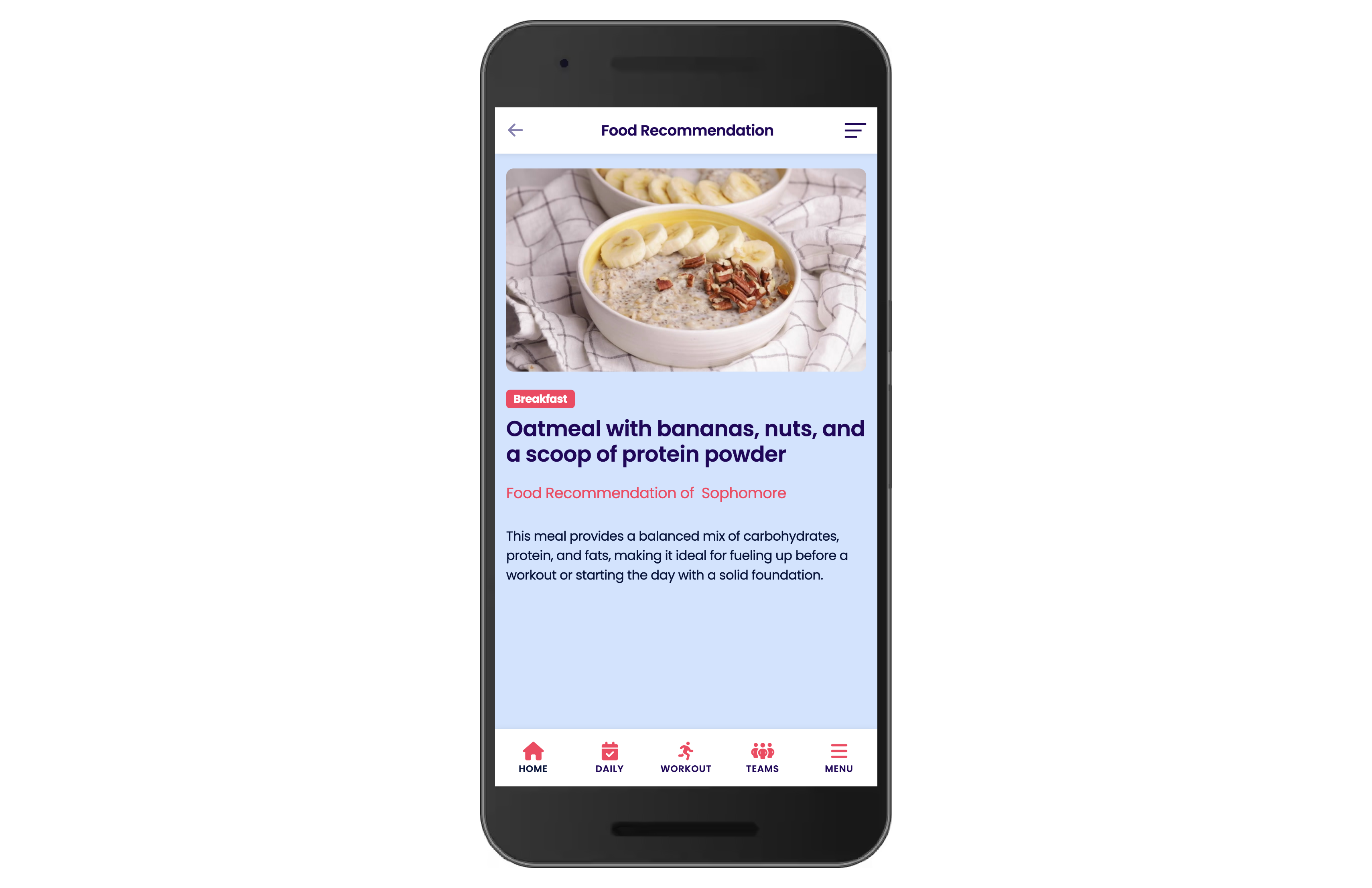 Nutrition Guide: View assigned meal plans (e.g., "Oatmeal with bananas... for Breakfast") with explanations.