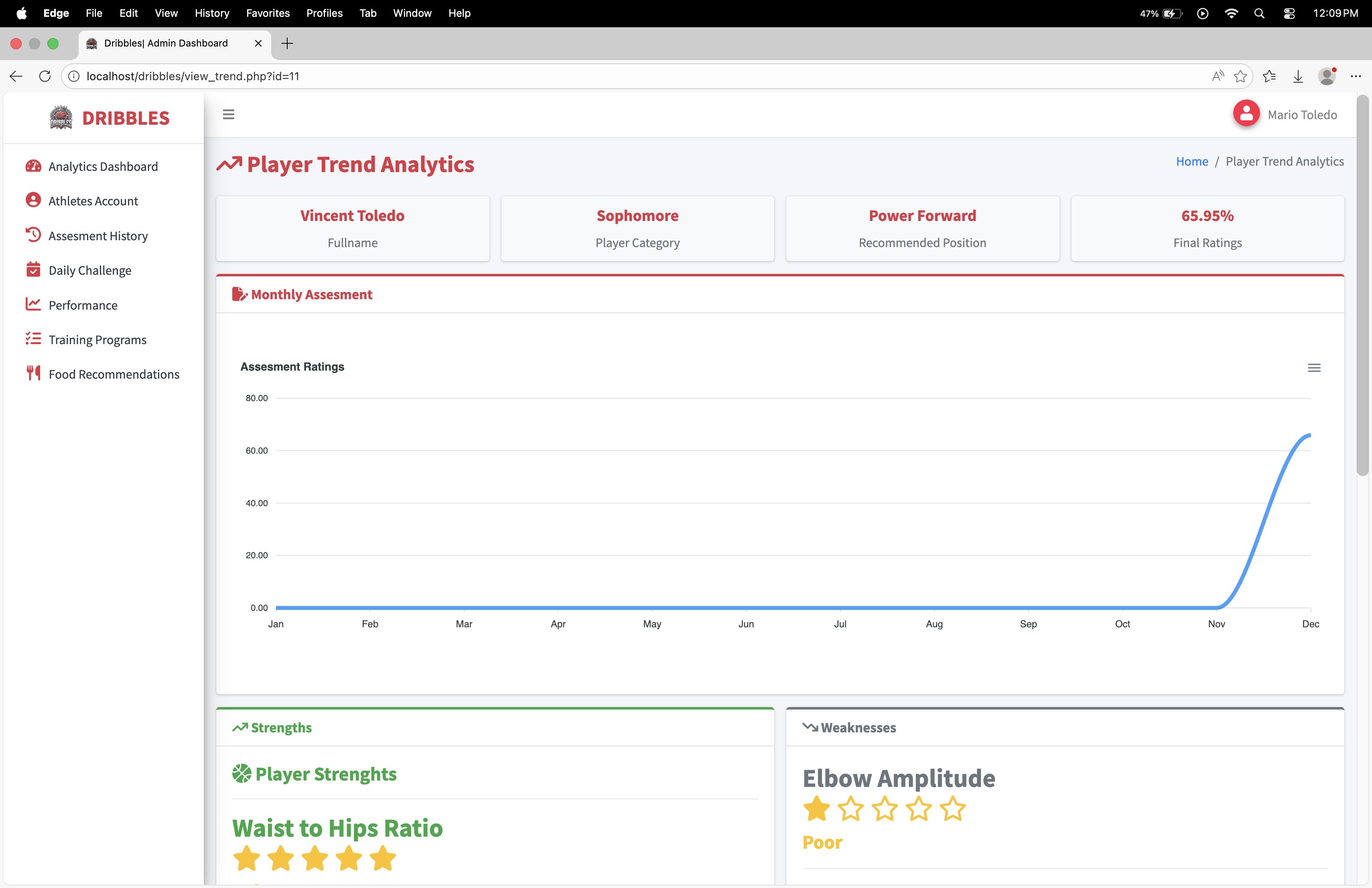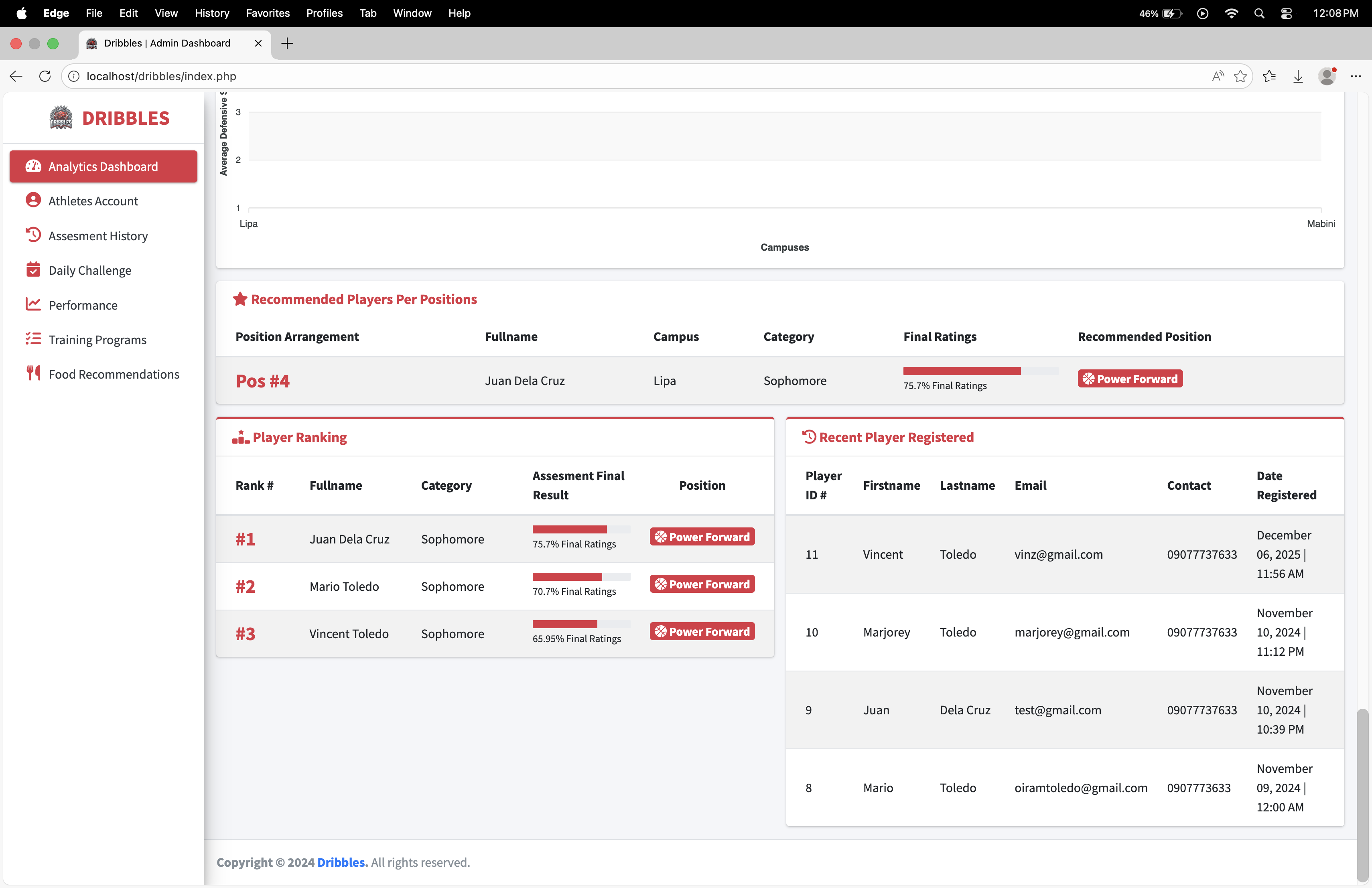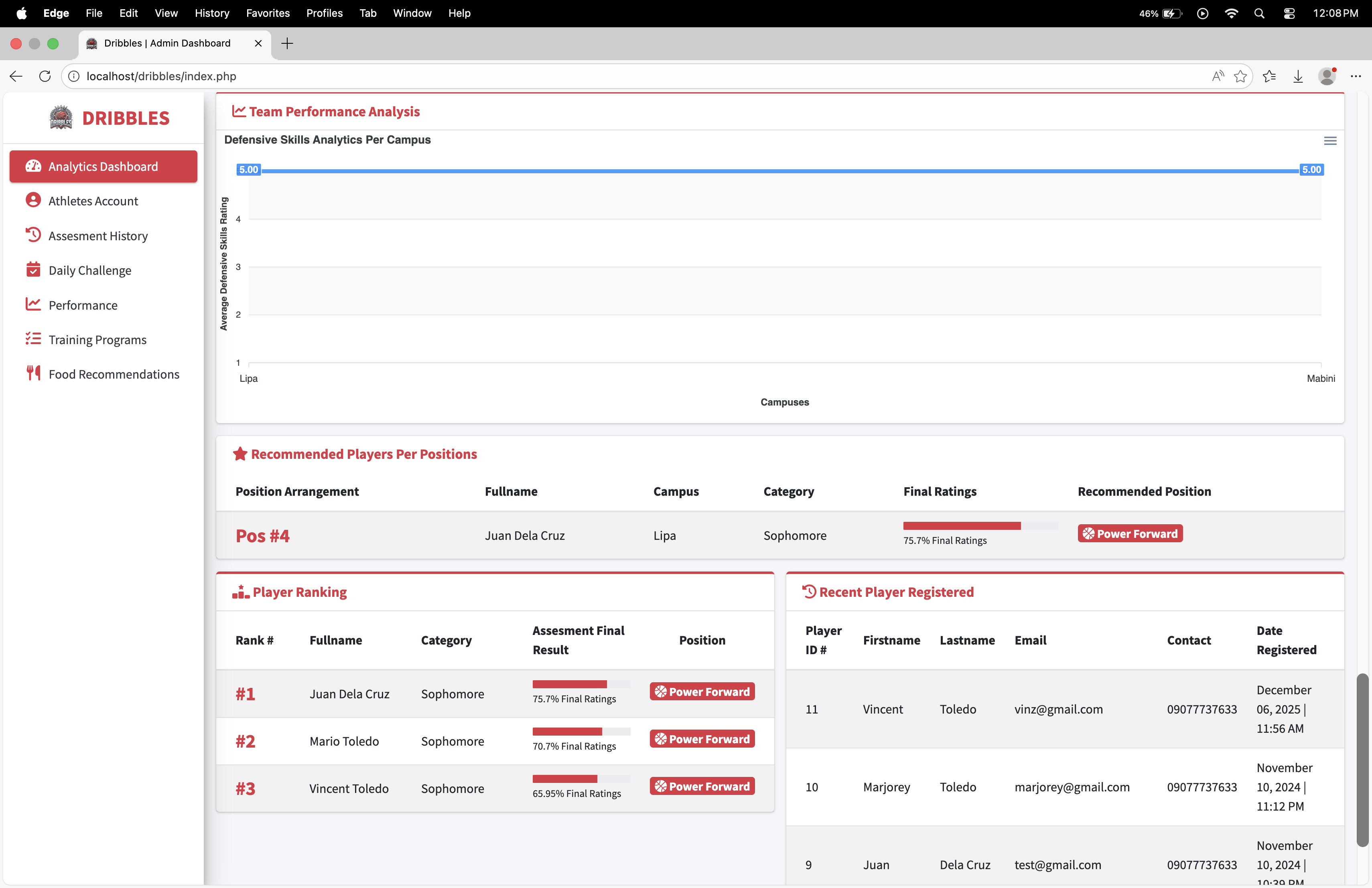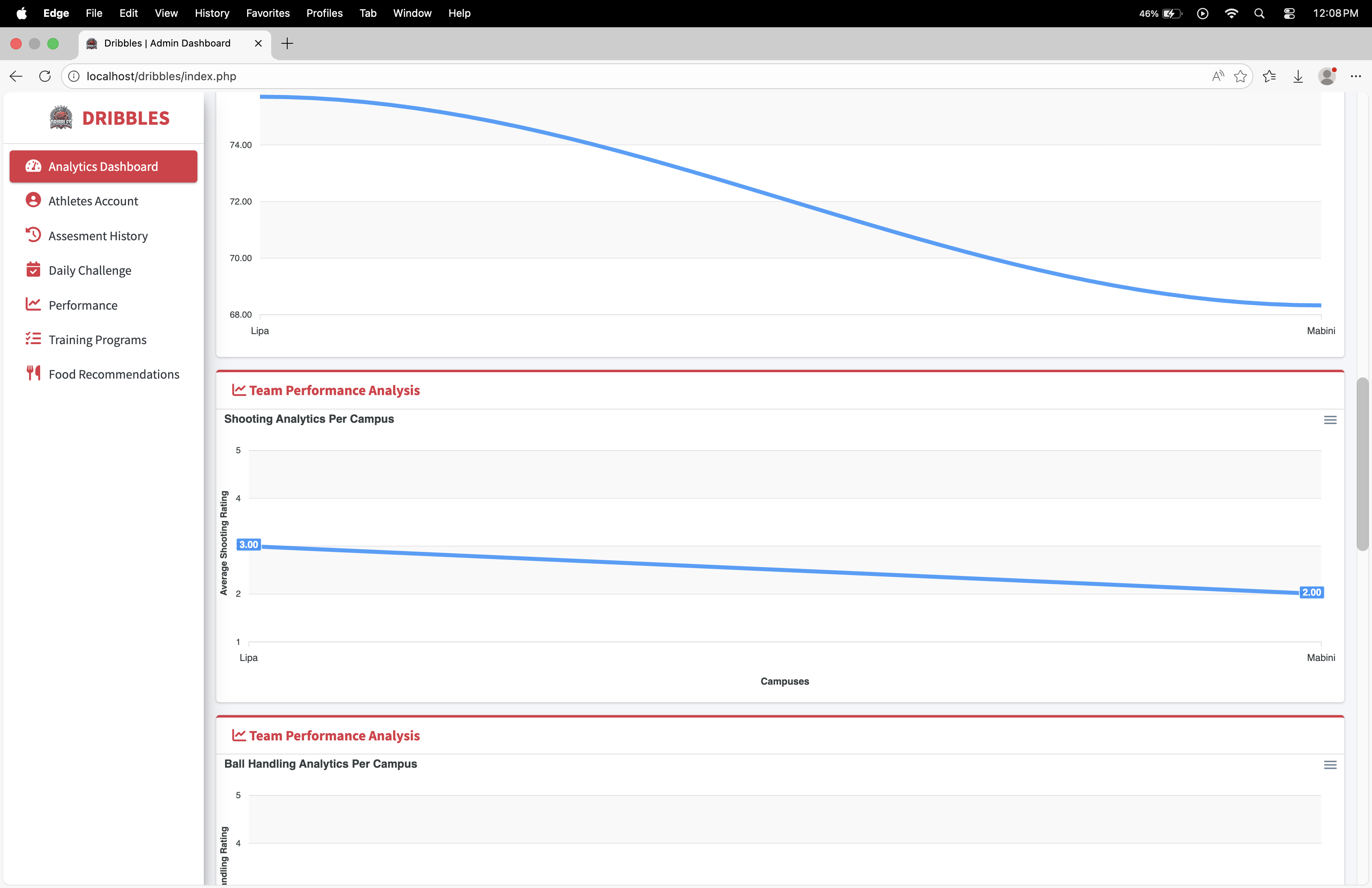Dribbles is a comprehensive, data-driven athlete management and development platform designed specifically for basketball student-athletes, such as those at BSU Malvar. The system bridges the gap between raw potential and structured growth by transforming personal athletic data into actionable, personalized training and nutrition plans.